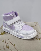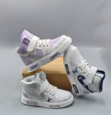 کفش کتانی بچهگانه مدل Louis Vuitton (لوئیس ویتون) با طراحی مدرن و ترکیب رنگ سفید با جزئیات بنفش و سورمهای، انتخابی عالی برای استایل روزمره و اسپرت کودکان است.